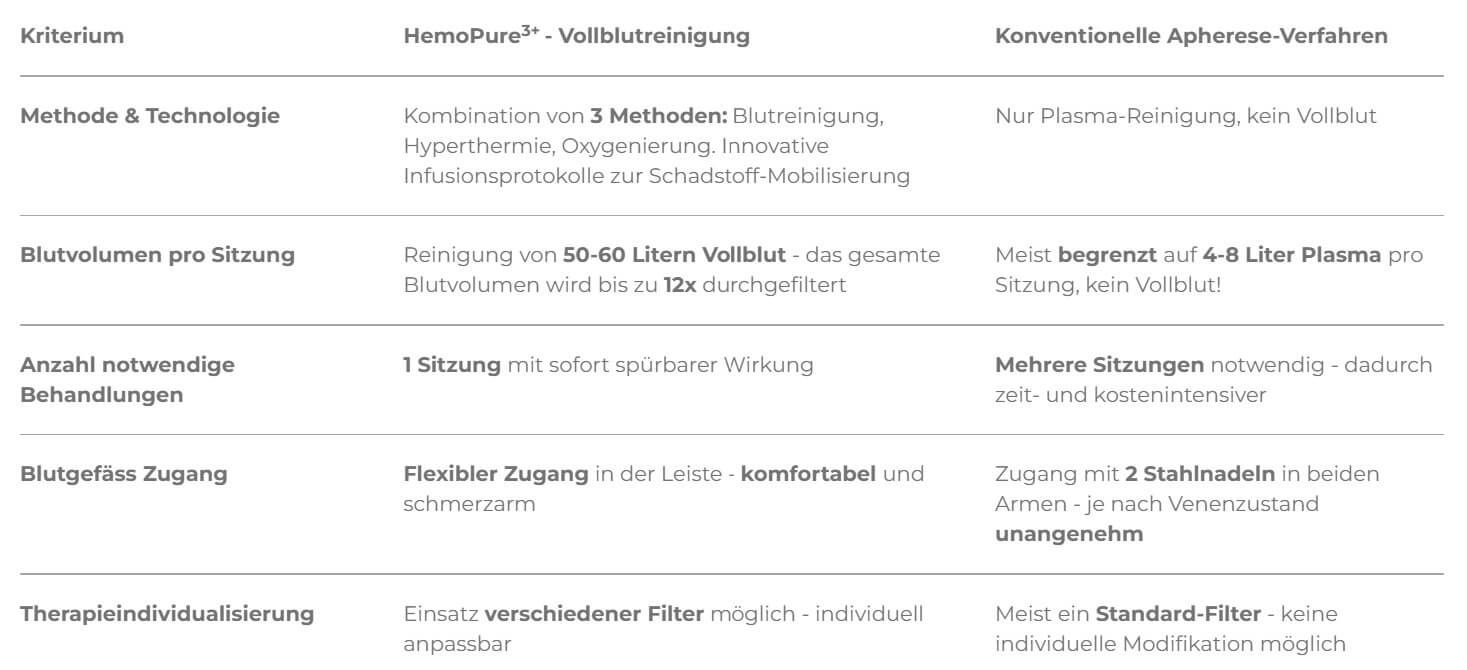 Während bei der Apherese nur das Blutplasma isoliert gefiltert wird, wird bei der HemoPure3+-Methode das gesamte Blut (Vollblut) gefiltert – schonend, effektiv und ohne Bluttrennung. Zum Einsatz kommen spezielle Adsorber mit einer Filterfläche von bis zu 68'000 m². Der dreistufige Ablauf bestehend aus Filtration, Erwärmung und Sauerstoffanreicherung ist innovativ und unterscheidet sich grundlegend von klassischen Verfahren. In einer einzigen Sitzung können bis zu 60 Liter Blut gereinigt werden – das entspricht etwa dem Zehnfachen des körpereigenen Blutvolumens. Zum Vergleich: Bei herkömmlichen Verfahren werden pro Sitzung meist nur 4-8 Liter Plasma behandelt - und kein Vollblut!